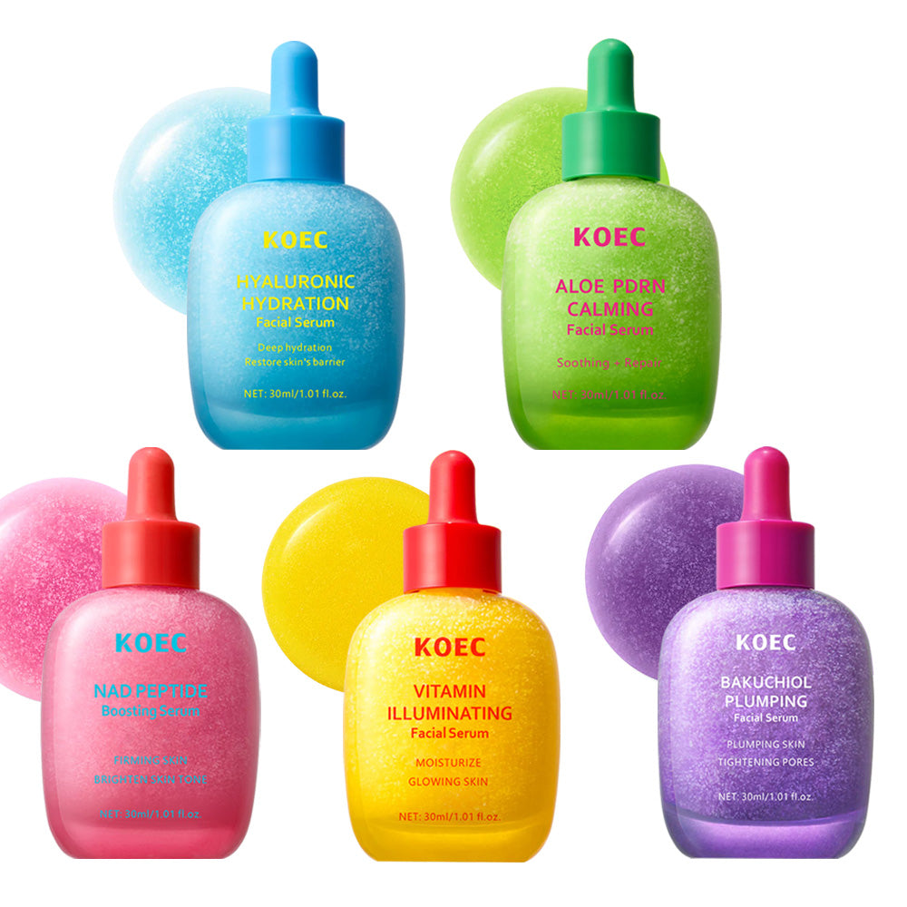 A curated set of 5 targeted facial serums, each formulated to address specific skincare needs—from plumping and brightening to firming, calming, and deep hydration.