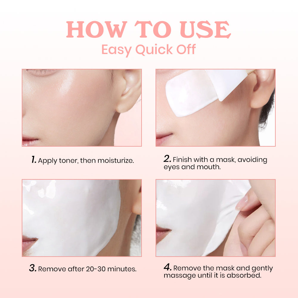 Anwendung: Zuerst Gesichtswasser auftragen, dann Feuchtigkeitscreme. Anschließend die Maske auflegen und dabei Augen- und Mundbereich aussparen. Nach 20–30 Minuten entfernen. Die Maske abnehmen und sanft einmassieren, bis sie vollständig eingezogen ist.