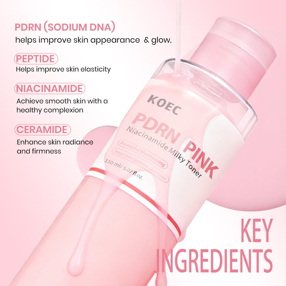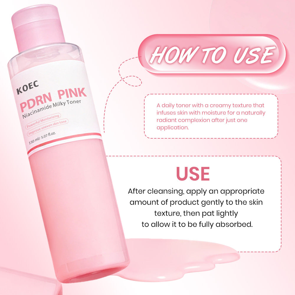Elevate your skincare routine with our PDRN Pink Niacinamide Milky Toner—a gentle, hydrating toner crafted to deliver dewy radiance, strengthen the skin barrier, and promote a luminous pink glow. Formulated for acne-prone and all skin types, this non-comedogenic milky toner absorbs quickly to nourish every skin layer, leaving skin smooth, balanced, and visibly glowing.