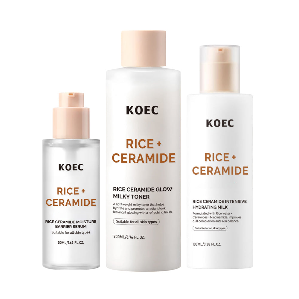 This rice ceramide-powered skincare trio features a milky toner, moisture barrier serum, and intensive hydrating milk, working in harmony to strengthen the skin’s moisture barrier, deliver long-lasting hydration, and reveal a luminous, healthy glow. Infused with rice extracts and ceramides—key ingredients for barrier repair—each product layers seamlessly to soothe dry, sensitive skin and lock in moisture for a plump, dewy complexion.