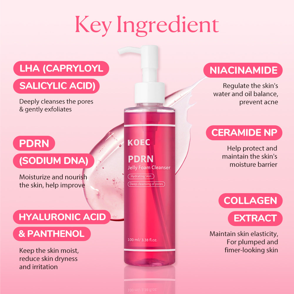 Elevate your daily cleansing routine with our PDRN Jelly Foam Cleanser—a innovative gel-to-foam face wash designed to deep clean without disrupting your skin’s natural balance. Infused with PDRN, collagen, and nourishing hydrators, this mild low-pH formula delivers gentle exfoliation, pore refinement, and long-lasting moisture for a clearer, smoother, and radiant complexion.